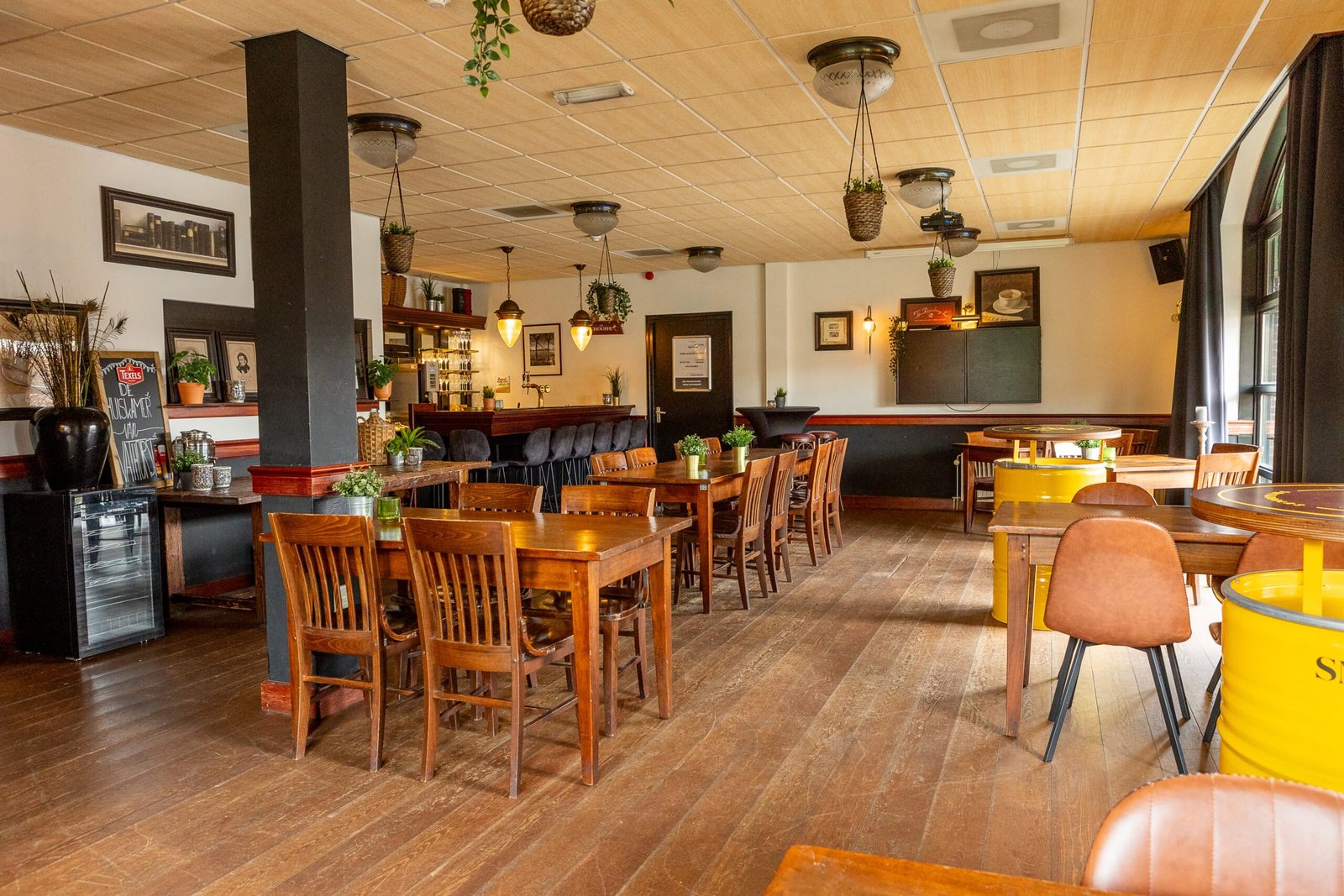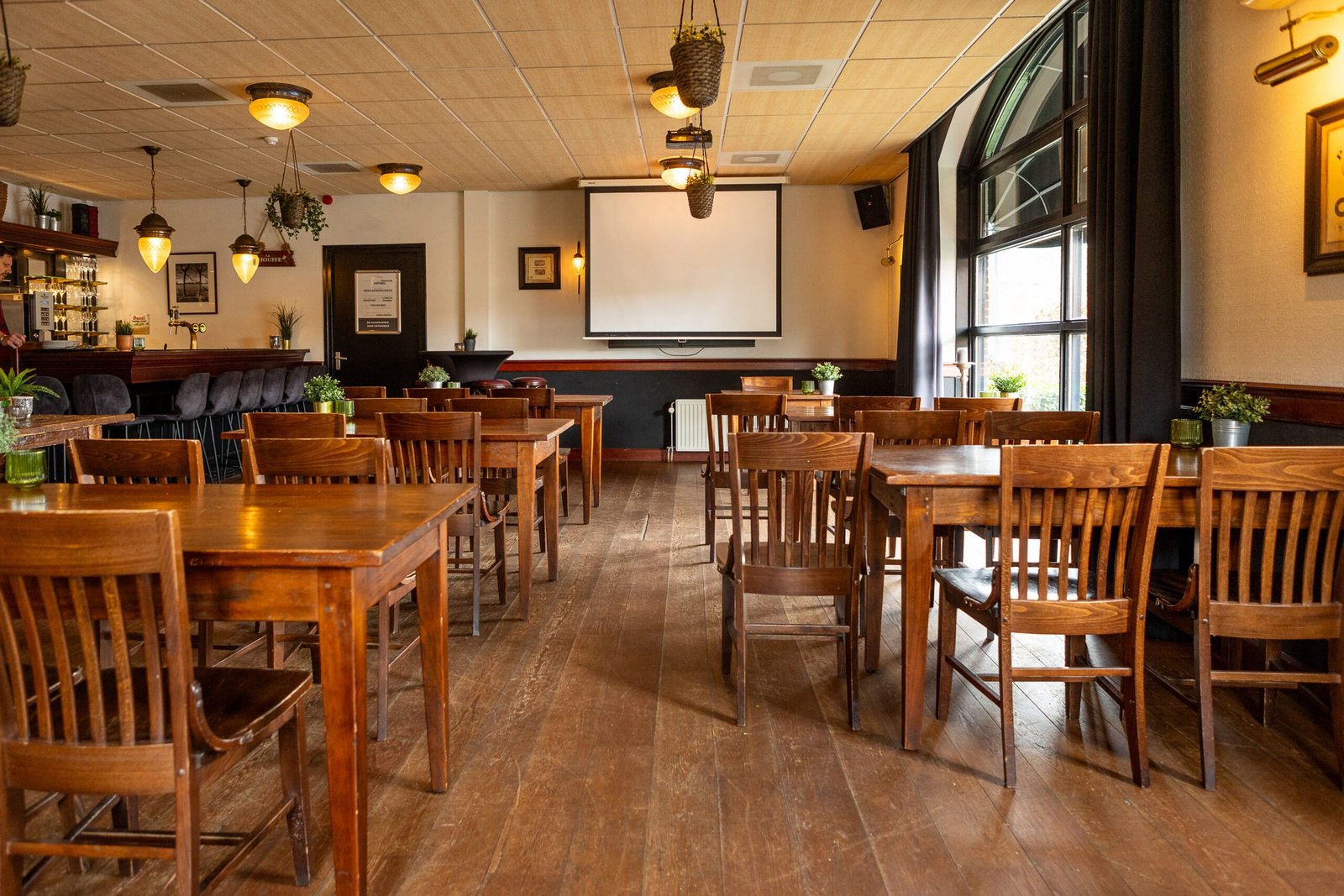 De zaal is sfeervol ingericht en beschikt over zijn eigen privébar en -terras.